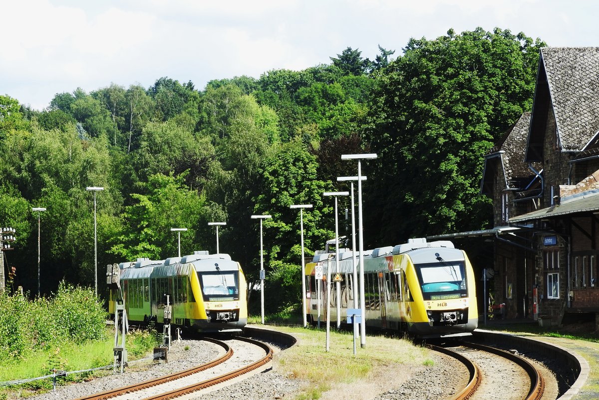 Am 20.8.2016 warten 2 Triebwagenzüge VT 261.2 der HLB im Bahnhof Hachenburg auf