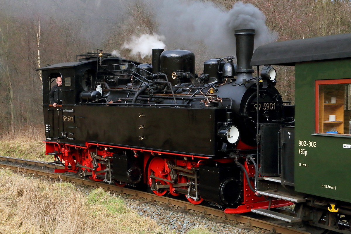 Da wir gut im Zeitplan lagen, gab es bei der IG HSB-Sonderzugfahrt am 07.02.2016 noch eine außerplanmäßige Scheinanfahrt an der beliebten Fotostelle in Höhe der kleinen Waldlichtung zwischen Mägdesprung und Sternhaus-Ramberg. Kaum daß ich aus dem Zug war, bot sich 99 5901, trotz bedeckten Himmels, in einem so schönen Licht an, daß ich partout nicht "Nein" sagen konnte! ;-)