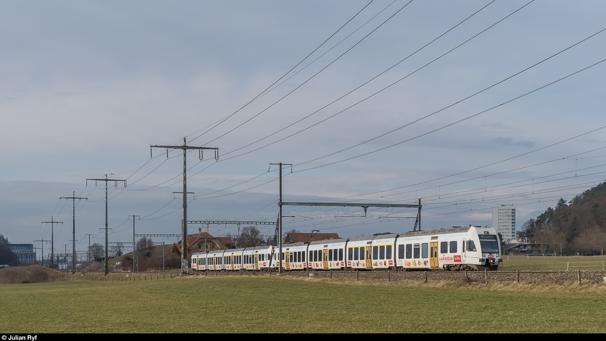Der Kambly-Zug besteht seit dem Fahrplanwechsel im Dezember 2016 aus zwei Lötschbergern. Am 11. Februar 2017 konnten RABe 535 115 und 114 als RE Bern - Luzern bei Ostermundigen abgelichtet werden.