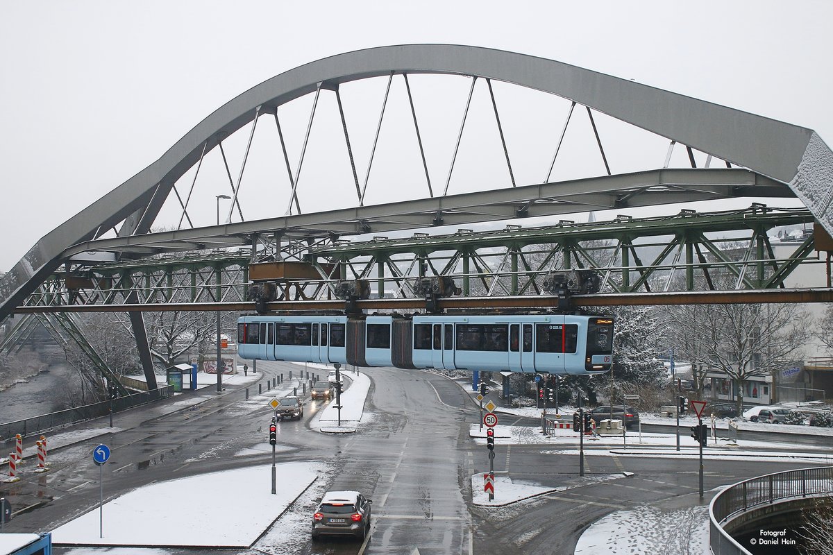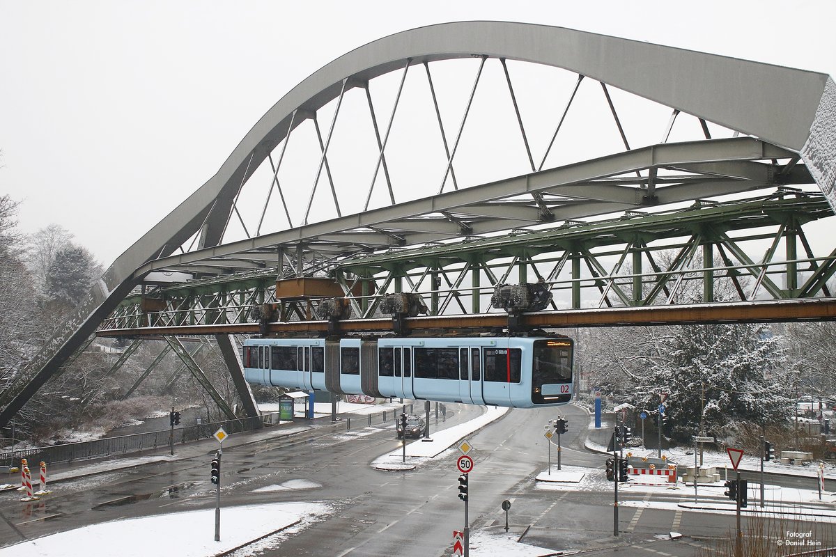 Die neue Schwebebahn GN02 an der Ohligsmühle in Wuppertal, Februar 2017.