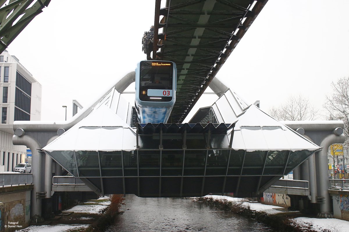 Die neue Schwebebahn GN03 am Bahnhof Ohligsmühle in Wuppertal, am Februar 2017.