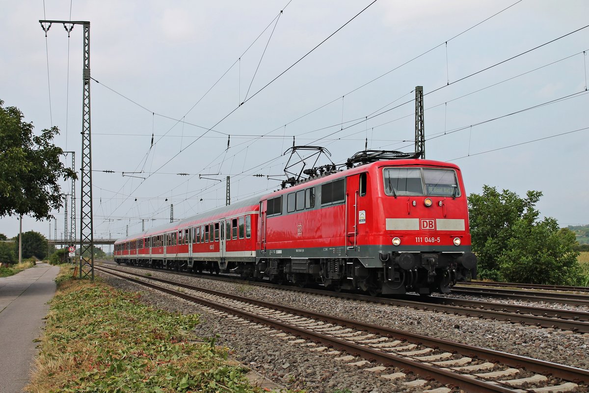 Einfahrt von der Freiburger 111 048-5 am 10.08.2015 mit ihrer RB (Offenburg - Basel Bad Bf) in den Bahnhof von Müllheim (Baden).