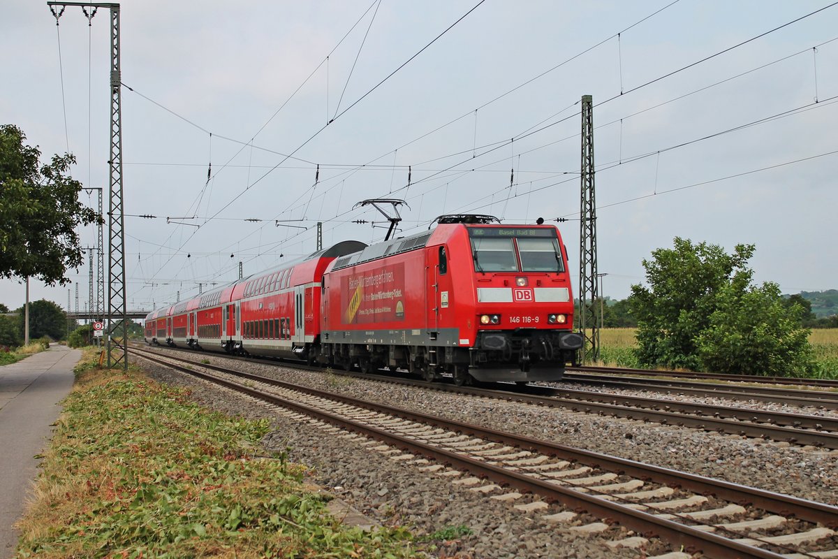 Einfahrt von der Freiburger 146 116-9 "Baden Württemberg erfahren/Landkreis Lörrach" am 10.08.2015 mit ihrem RE (Offenburg - Basel Bad Bf) in den Bahnhof von Müllheim (Baden).