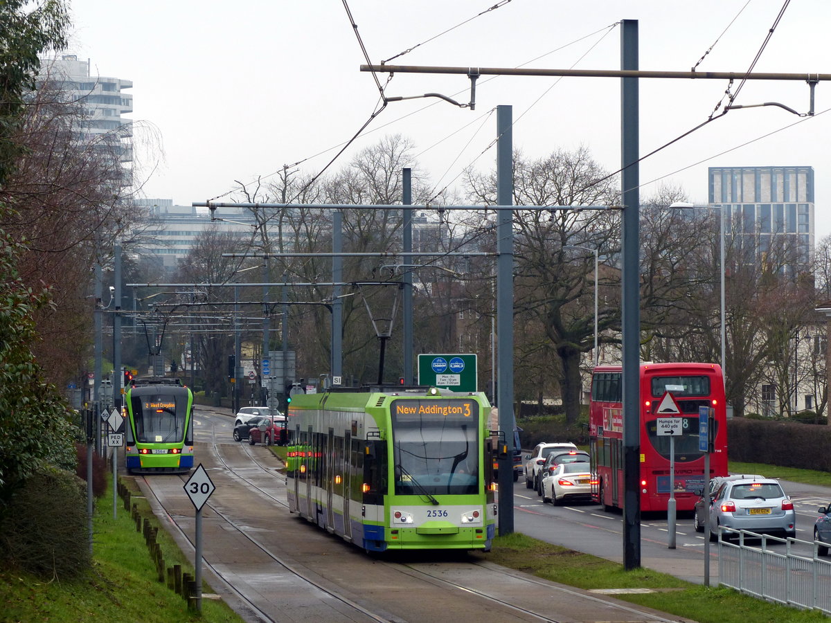 In Sandilands gehört die Straßenbahn zum gewohnten Stadtbild. Im Bild sieht man beide im Einsatz befindlichen Fahrzeugtypen: Links eine von insgesamt 12 Variobahnen (Stadler, Schweiz), rechts eine von 24 Bahnen des Typs CR4000 (Bombardier, Wien), die weitgehend den in Köln eingesetzten K4000 entsprechen. 31.1.2017, Croydon (London)