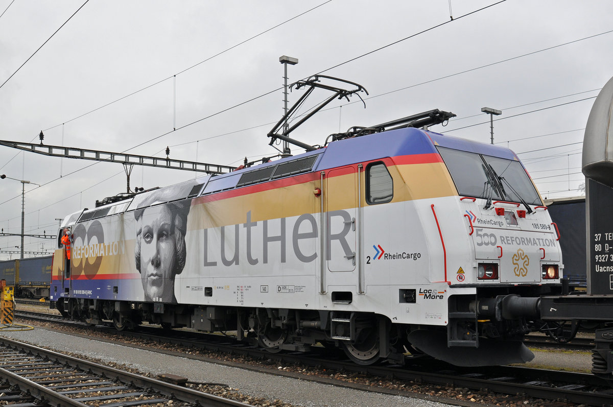 Lok 185 589-9, mit einer Werbung für die 500 Jahre Reformation von Martin Luther, durchfährt den Güterbahnhof Muttenz. Die Aufnahme stammt vom 06.02.2017.
