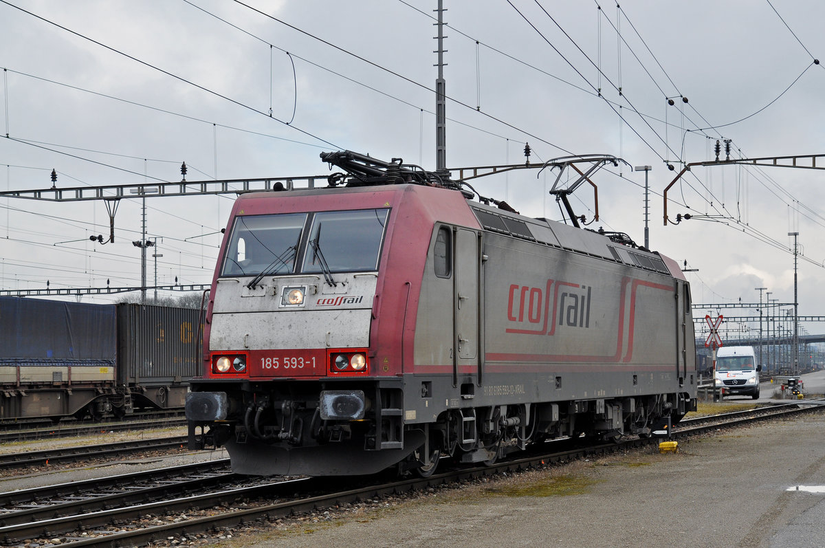 Lok 185 593-1 verlässt den Güterbahnhof Muttenz. Die Aufnahme stammt vom 06.02.2017.