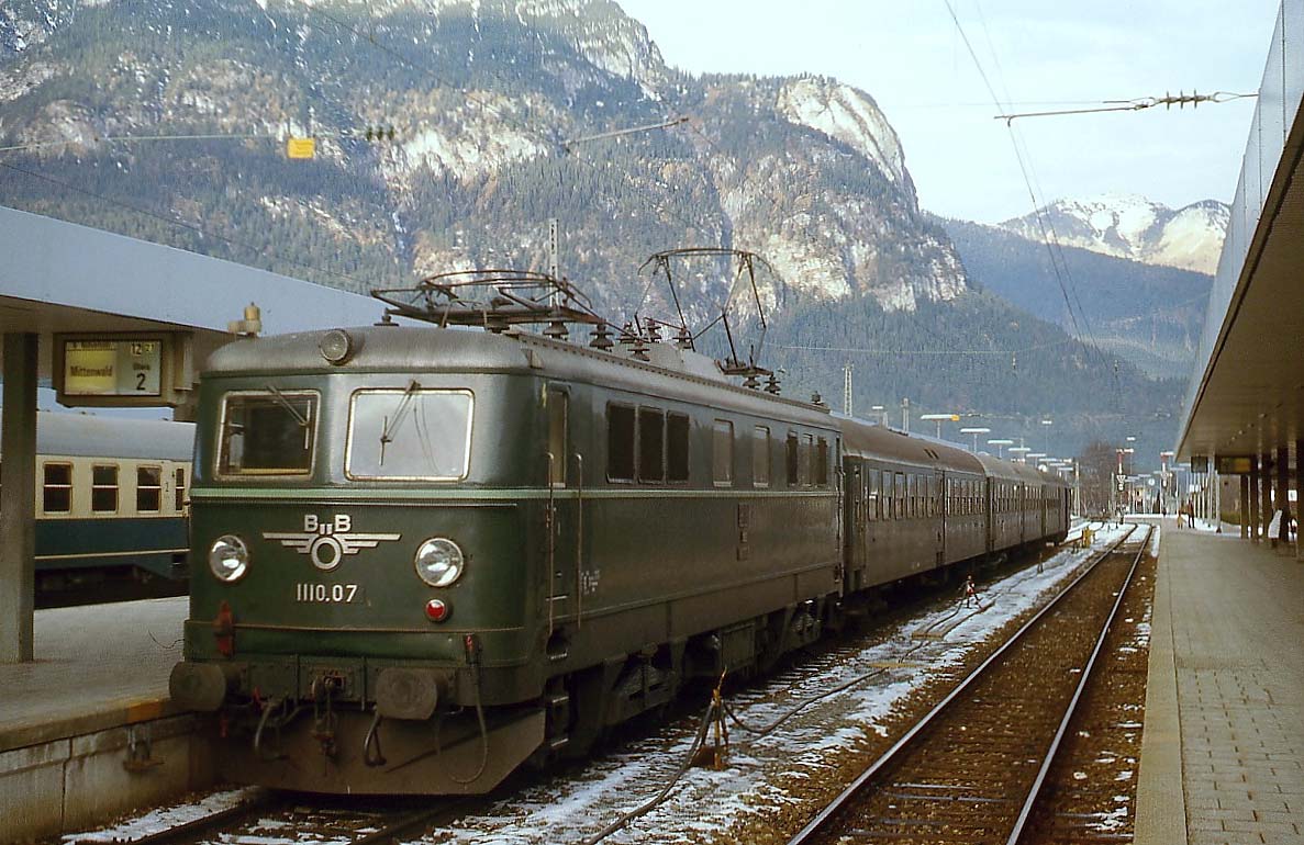 Mit einem aus ÖBB-Wagen gebildeten Nahverkehrszug nach Mittenwald steht 1110.07 im Dezember 1978 abfahrbereit im Bahnhof Garmisch-Partenkirchen