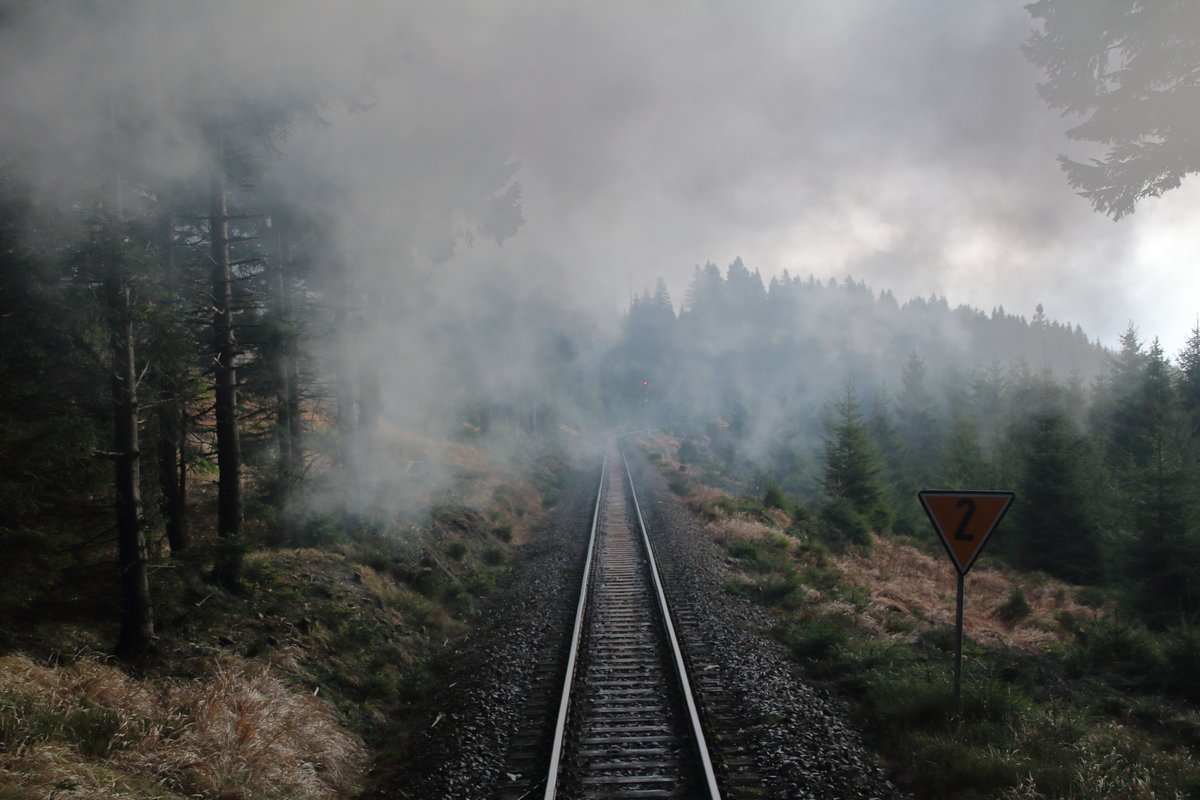 Mysteriös wirkt die Fahrt rauf auf den "Bloxberg". Die Plattform des letzten Wagens ist einer der beliebtesten Plätze im Zug auf den Brocken. Die Aufnahme aus P8931 (Wernigerode - Brocken) entstand kurz hinter dem Bahnübergang der Brockenstraße hinter Schierke.