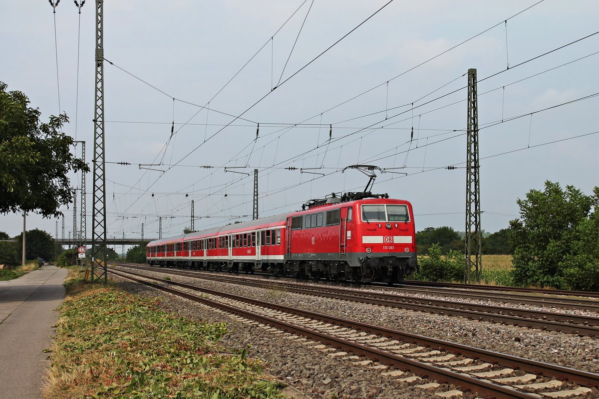 Nachschuss am 10.08.2015 auf die Freiburger 111 061, welche ihre RB (Basel Bad Bf - Offenburg) aus dem Bahnhof von Müllheim (Baden) in Richtung Buggingen schiebte.