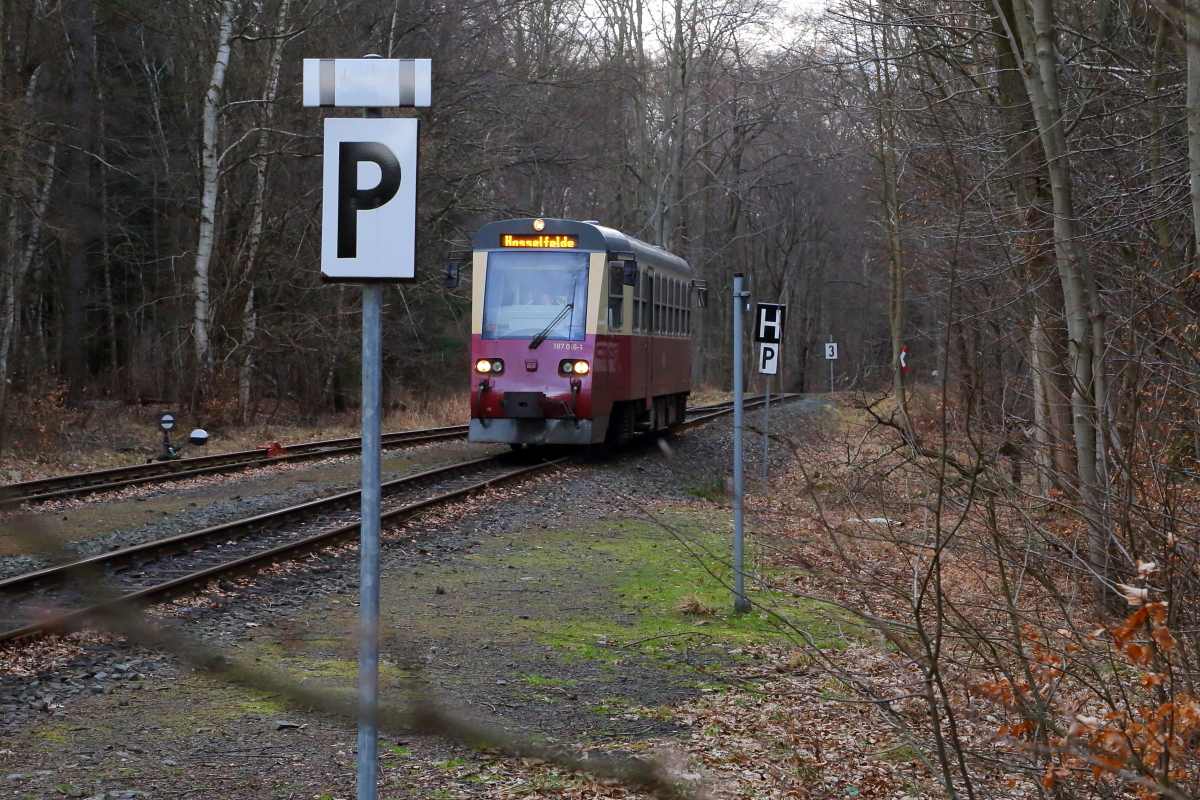 Schuß aus der Hecke! Eingekeilt von zahlreichen anderen Fotografen, bot sich mir am späten Nachmittag des 07.02.2016, bei der Einfahrt von Triebwagen 187 016 (P8937 Quedlinburg-Hasselfelde) in den Haltepunkt Sternhaus-Ramberg, nur diese Perspektive, welche m.E. aber auch nicht so ganz unattraktiv ist! ;-)