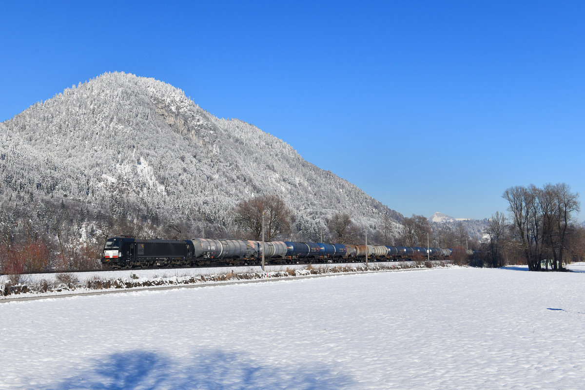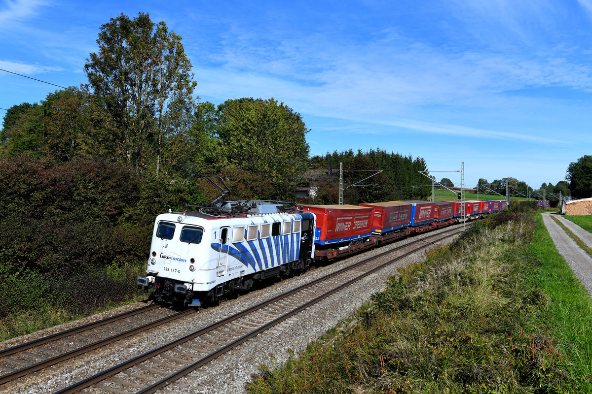 Der DGS 43139 von Wuppertal nach Verona Q.E. - stets einheitlich mit Aufliefern der Spedition Winner beladen - wird zwischen München Ost Rbf und Kufstein gerne mit etwas "Altwertigem" aus dem Bestand von Lokomotion bespannt. So auch am 26. September 2018, als die 139 177 für diesen Dienst eingeteilt war und mir mit besagtem Zug am Bü Vogl vor die Linse fuhr.