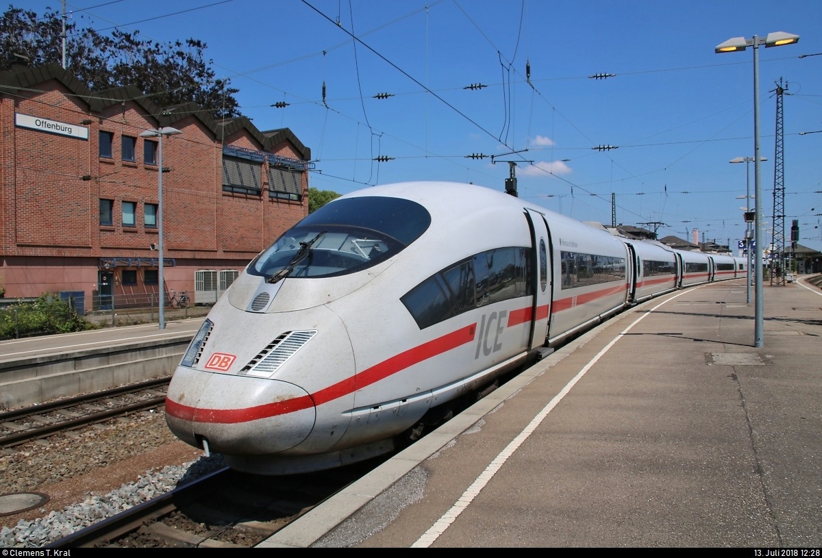 Nachschuss auf 401 087-2 (Tz 187; seit 16.12.2017 "Gießen", trägt aber immer noch "Mühldorf a. Inn") als verspäteter ICE 370 (Linie 12) von Basel SBB (CH) nach Berlin Ostbahnhof, der den Bahnhof Offenburg auf Gleis 3 erreicht.