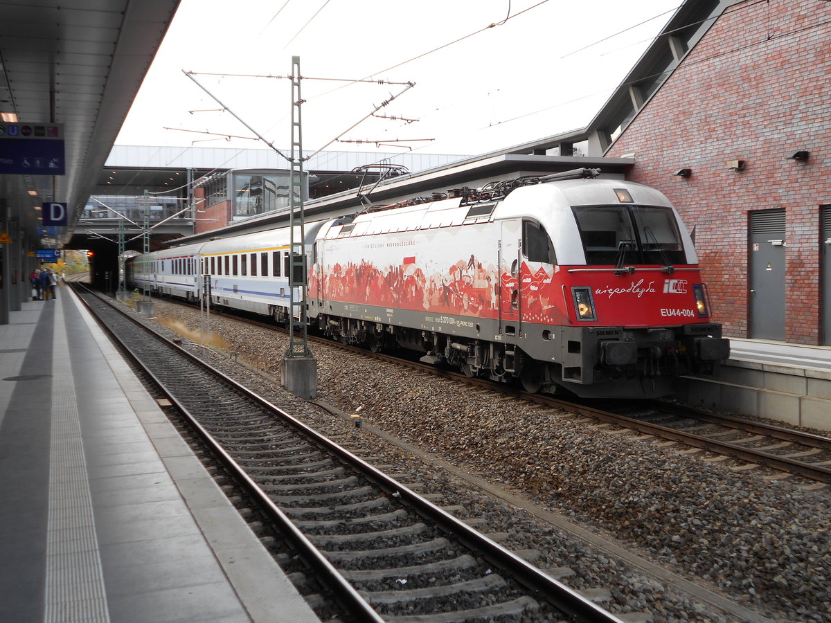Am 26. September 2018 bespannte die Achensee-Lok 1216.019 den EC 85 nach Bologna Centrale. Am Bü Vogl passierte der Zug in flotter Fahrt meinen Fotostandpunkt.