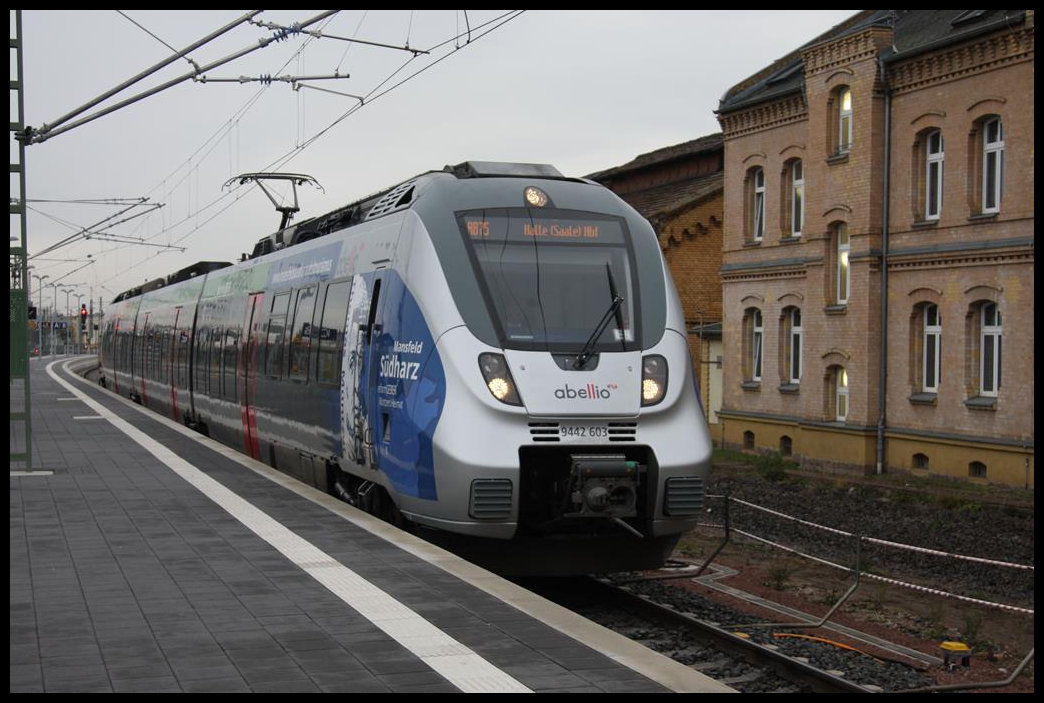 Abellio Triebwagen 9442603 aus Lutherstadt Eisleben fährt hier am 19.12.2018 um 10.22 Uhr i den HBF Halle an der Saale ein.