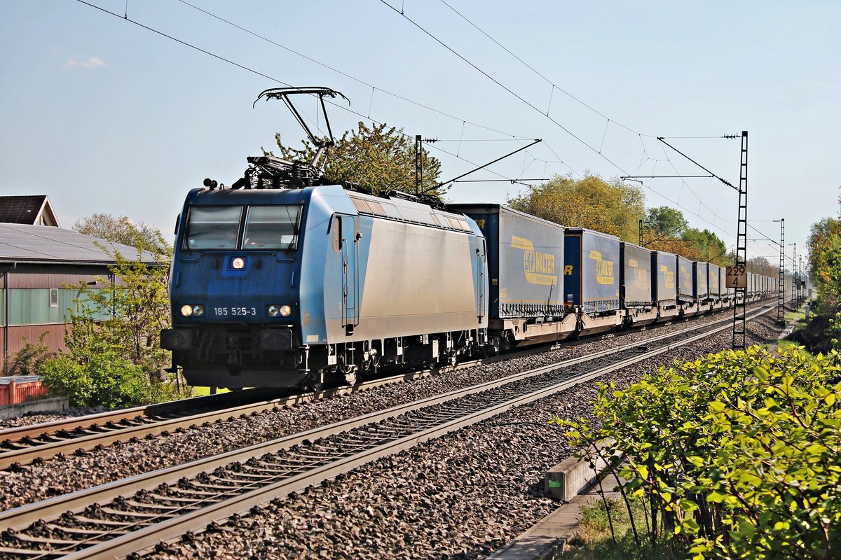 ATLU/XRAIL 185 525-3 am Nachmittag des 13.04.2017 mit einem "LKW Walter"-KLV nach Belgien bei Heitersheim und fuhr mit diesem in Richtung Norden.
