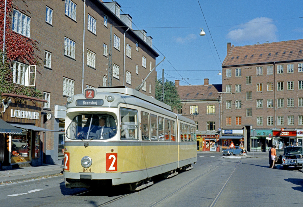 København / Kopenhagen Københavns Sporveje: Am Sonntag dem 28. September 1969 gab es eine Sonderfahrt für Mitglieder der Sporvejshistorisk Selskab (: der Dänischen Gesellschaft für Straßenbahngeschichte) mit dem Drehgestelltriebwagen 509 und dem Drehgestellbeiwagen 1503 auf der SL 2. - Das Foto entstand am Anfang der Sonderfahrt. Ort: Brønshøj, Brønshøjvej am Brønshøj Torv (torv: Markt). - Scan eines Farbnegativs. Film: Kodak Kodacolor X.