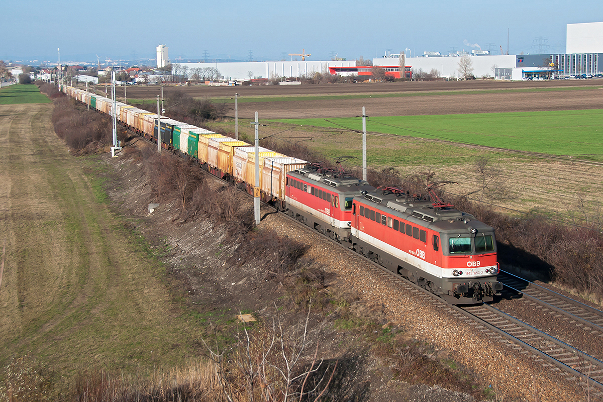 Kurz nach Mittag waren am 29.11.2018 diese beiden Loks der BR 1142 (1142 653 und 1142 XXX) mit einem Ganzzug in Fahrtrichtung Gramatneusiedl unterwegs. Die Aufnahme entstand bei Himberg.