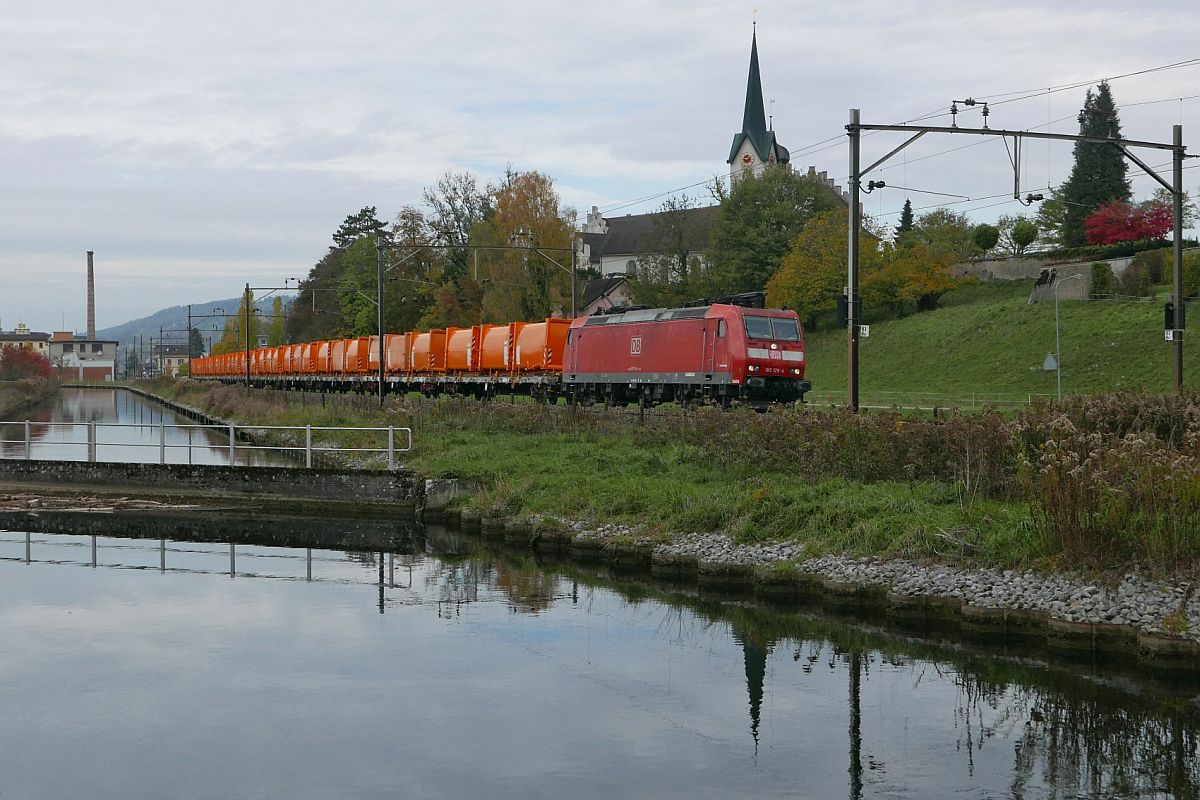 Nach der Entleerung der mit Hausmüll aus Singen und Konstanz befüllten Behälter in der Kehrrichtverbrennungsanlage Weinfelden befindet sich der "Müllzug" hier auf der Rückfahrt. Am 02.11.2018 zieht 185 129-4 in Bürglen (TG) die Wagen mit den entleerten Behältern am Thurkanal entlang über Kreuzlingen und Konstanz nach Singen.