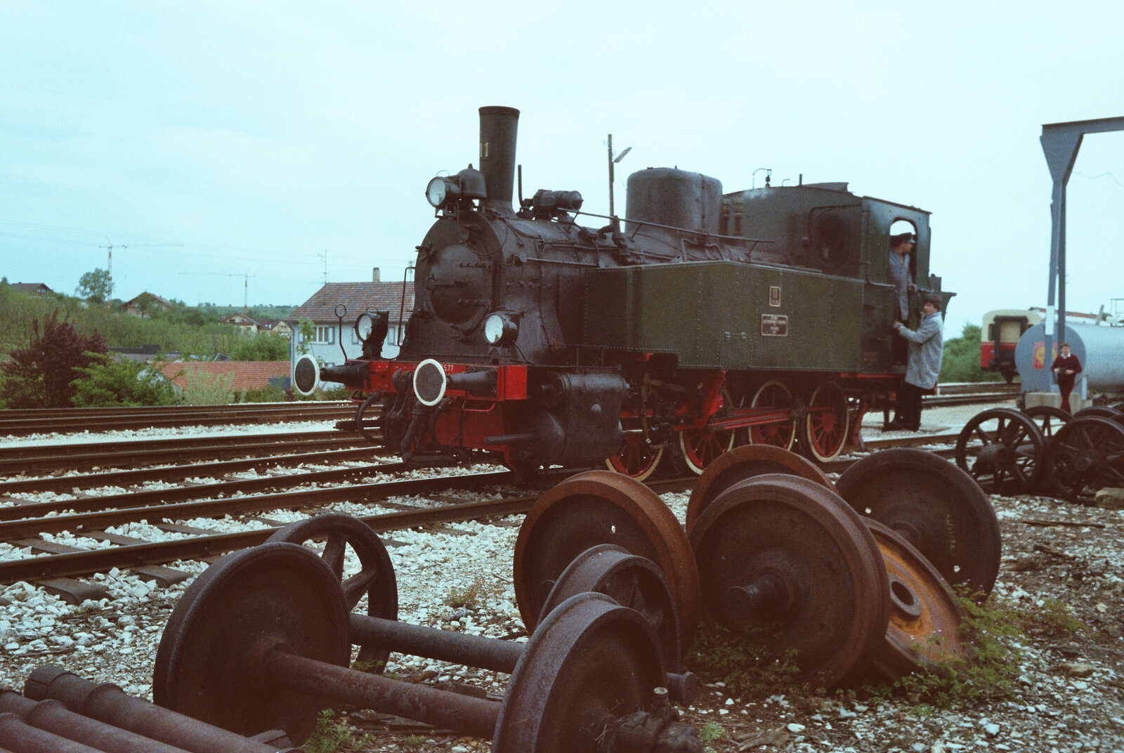 1983: Dampflokfahrt mit Lok 11 (ursprünglich Hohenzollerische Landesbahn HLB 11) auf der Tälesbahn (WEG) durchgeführt von der Gesellschaft zur Erhaltung von Schienenfahrzeugen (GES). Dampflok 11 ist eine vierachsige Universallokomotive der MF Esslingen von 1911. Frank Nowotny