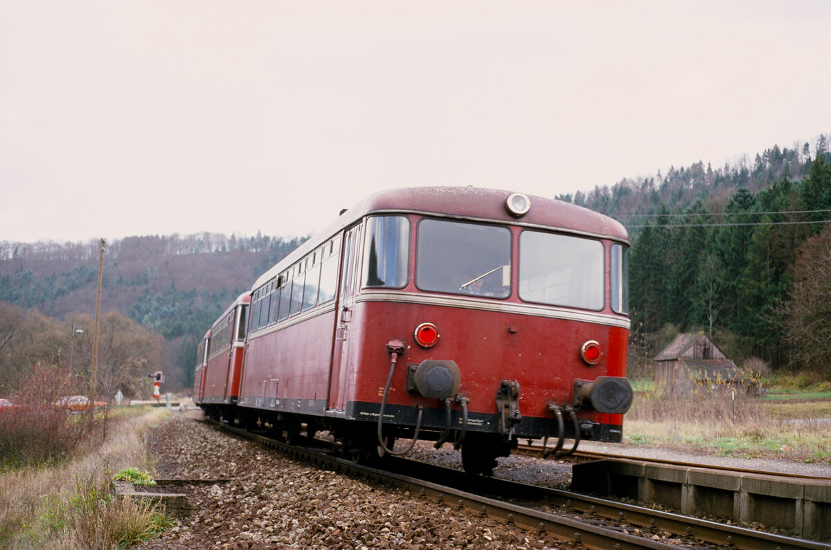 Bahnimpression: Uerdinger Schienenbuszug auf der DB-Bahnlinie Tübingen-Horb (24.11.1984)
