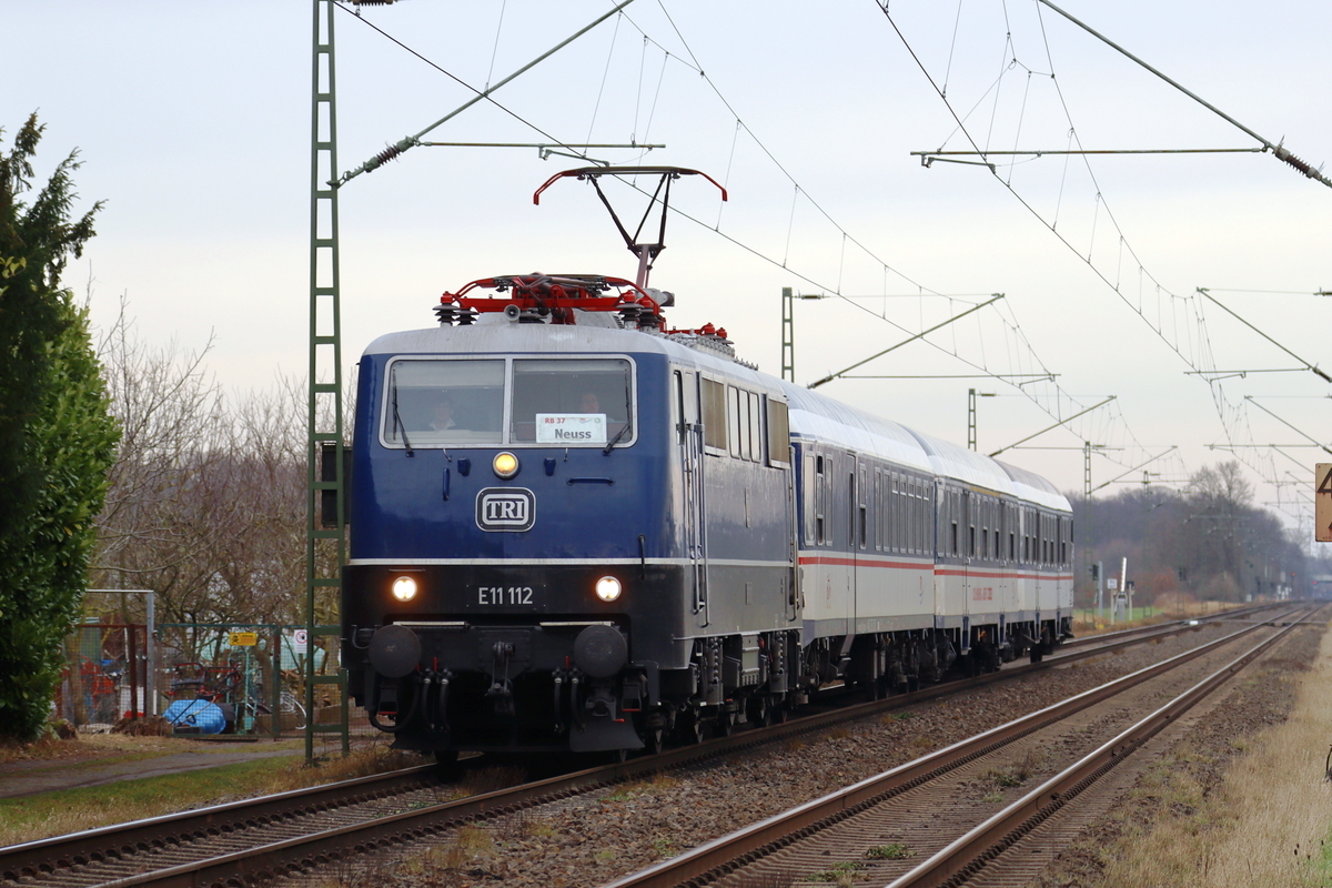 TRI E11 112 als RB 37 nach Neuss am BÜ km 46,368 bei Meerbusch 27.1.2026 GECP ZZ 6 / Le Fugeret, 7. Oktober 2025<br>