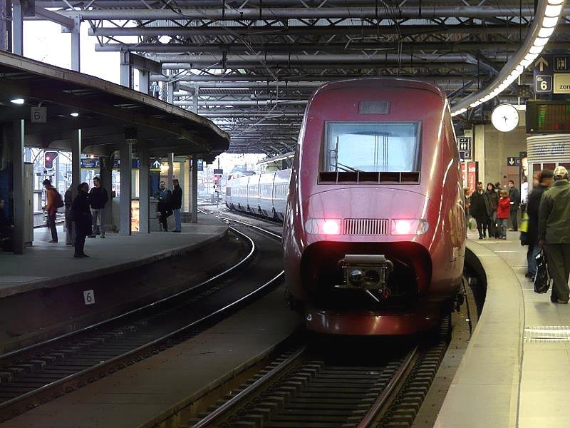 Dieser Thalys fährt die Rampe hoch, um auf die Strecke nach Frankreich zu gelangen. Deutlich sieht man eine dicke Beule auf dem Dach des Zuges, welche die Antenne zum Internetzugang verbrigt. Bruxelles Midi am 07.03.08 De Rond Hans und Jeanny