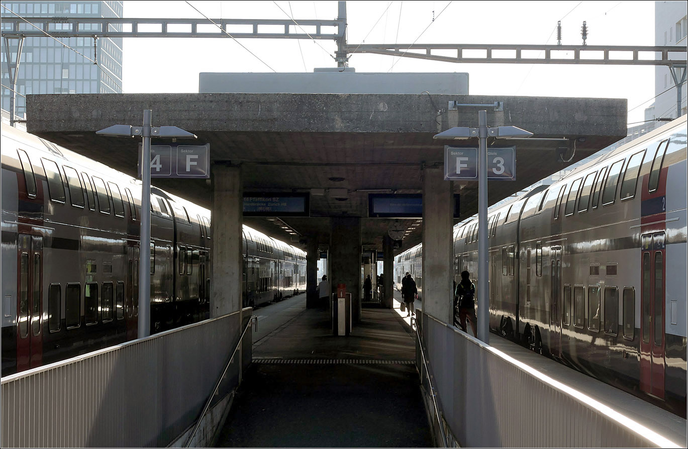 ... finden sich im Umfeld des Bahnhofes Zürich Altstetten. Auf dem äußeren Gleis ist ein IC das Limmattal hinunter unterwegs.