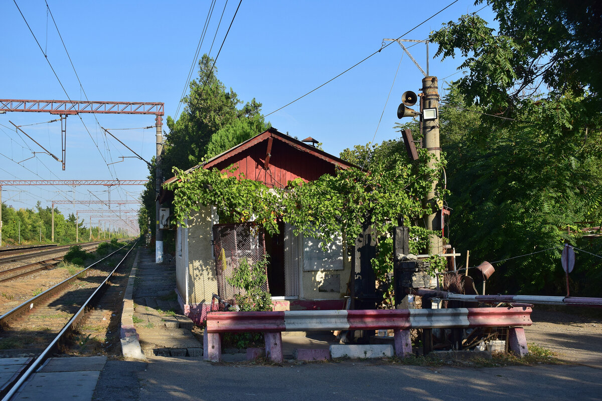 Bucuresti Triaj 08.09.2025 Blick auf den BÜ Posten am Bahnhof Bucuresti Triaj. Dieser BÜ Posten sichert die Strada Marmurei ab. Der Bahnübergang wird lediglich bei Bedarf geöffnet. Aufgenommen vom Bahnsteig.