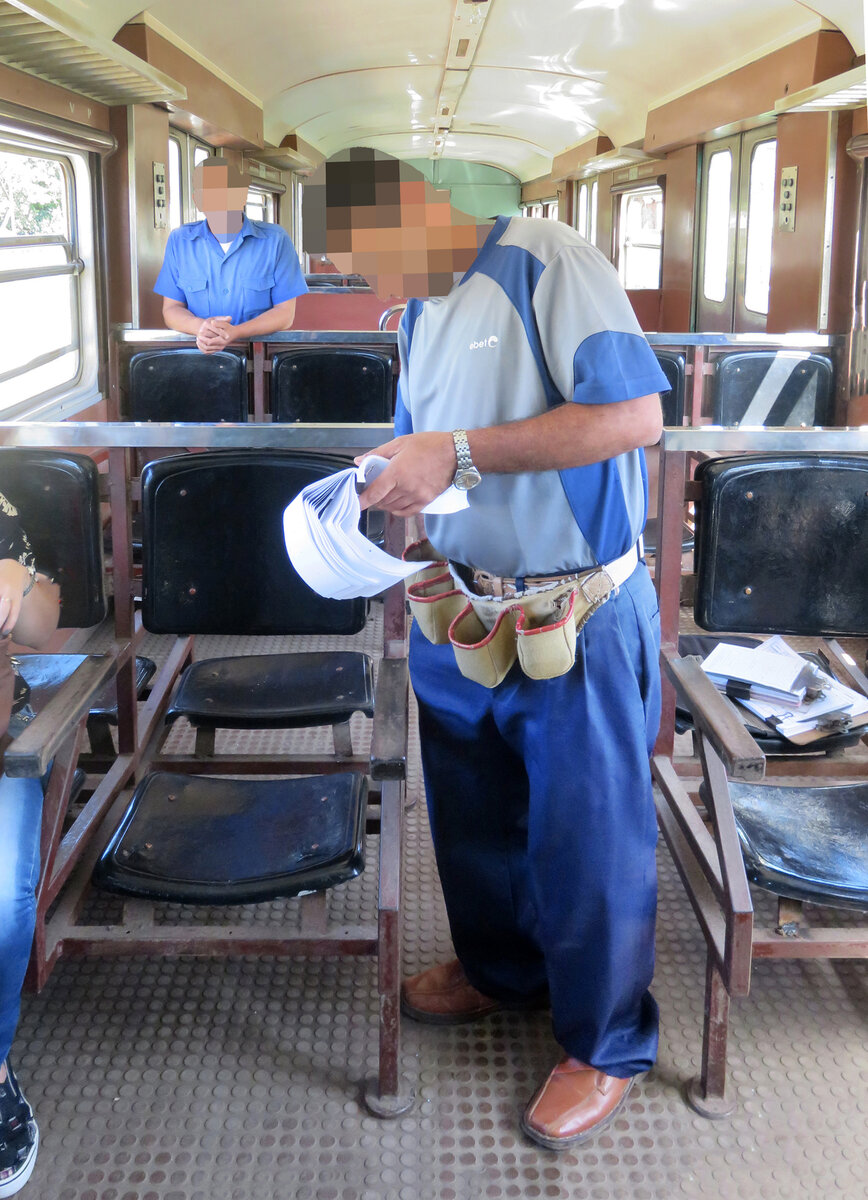 Das Trassee auf der Linie Camilo Cienfuegos - Jaruco der Hershey-Bahn lässt keine hohen Geschwindigkeiten zu. Camilo Cienfuegos - Jaruco, 11.02.2017 Fahrkartenverkauf im Hershey-Train mit einem grossen Fahrscheinheft im Zug. Am Anfang fuhren nur wenige Leute mit, der Fahrgastwechsel nahm aber während der Fahrt laufend zu. Camilo Cienfuegos - Jaruco, 11.02.2017 Das Innere im Triebwagen Nr. 707 der Hershey-Linie. Camilo Cienfuegos, 11.02.2017 Mit diesem Triebwagen Nr. 707 der Hershey-Bahn fuhren wir von Camilo Cienfuegos nach Jaruco und zurück. Der Bahnhof ist mit seinem kurzen Bahnsteig recht übersichtlich. Camilo Cienfuegos, 11.02.2017 Symbolischer geht's nicht für Kuba: Zwei wunderschöne Oldtimer im Bahnhof Hershey Train Station in Camilo Cienfuegos. Unser Zug fuhr aber an einer anderen Station ab. Camilo Cienfuegos, 11.02.2017 Deutschland