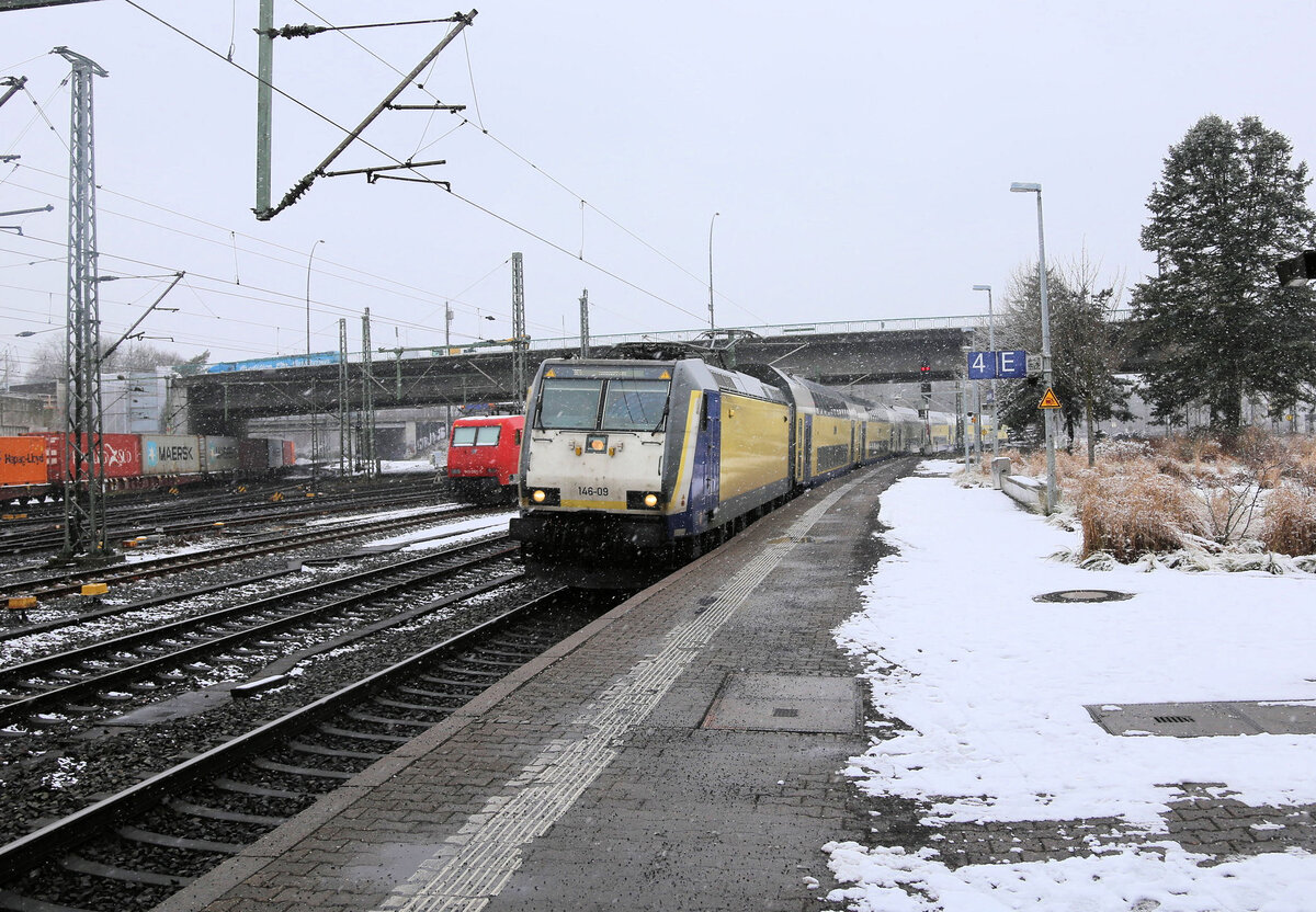 Metronom 146521 hält hier am 13.2.2026 um 13.50 Uhr mit einem RE nach Lüneburg in Hamburg-Harburg Gleis 4. Metronom 146-09 fährt mit einem RE nach Lüneburg am 13.2.2026 um 13.17 Uhr in Hamburg-Harburg Gleis 4 ein. Die Augsburger Straßenbahn im Winter -