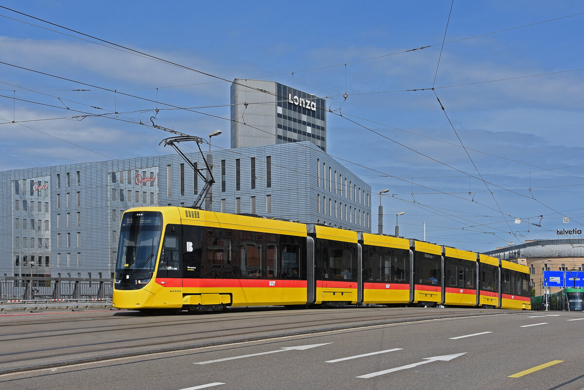 Be 6/8 Flexity 5002, auf der wegen einer Grossbaustelle umgeleiteten Linie 14, überquert am 11.08.2025 die Münchensteinerbrücke. Aufnahme Basel.
