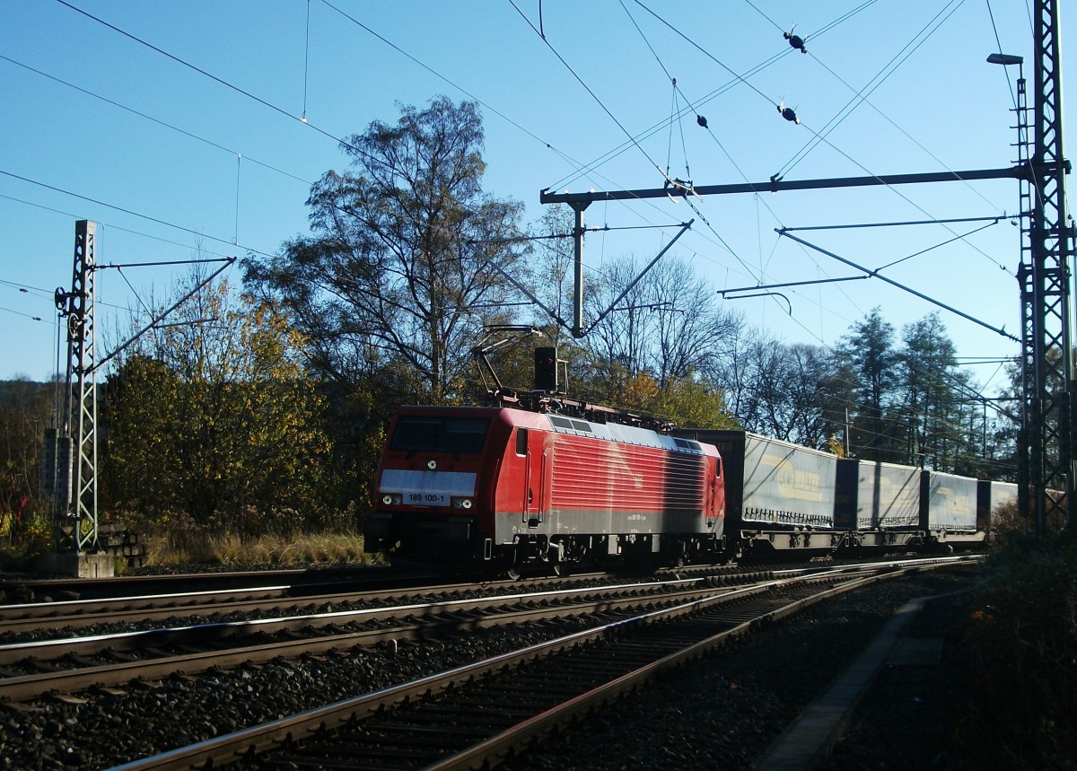 189 907 Lokomotion kommt  aus Richtung Koblenz mit einem langen EKOL-LKW-Zug aus Triest(I) nach Köln-Eifeltor und fährt in Richtung Köln auf der Rechten Rheinstrecke (KBS 465) bei Bad-Honnef am Rhein bei Sommerwetter am 15.8.2013.