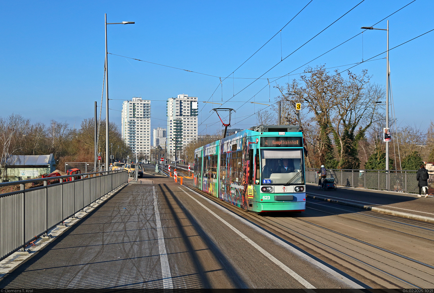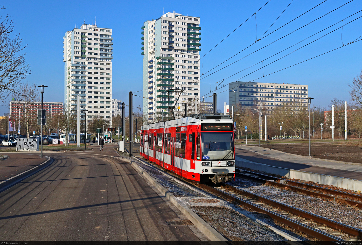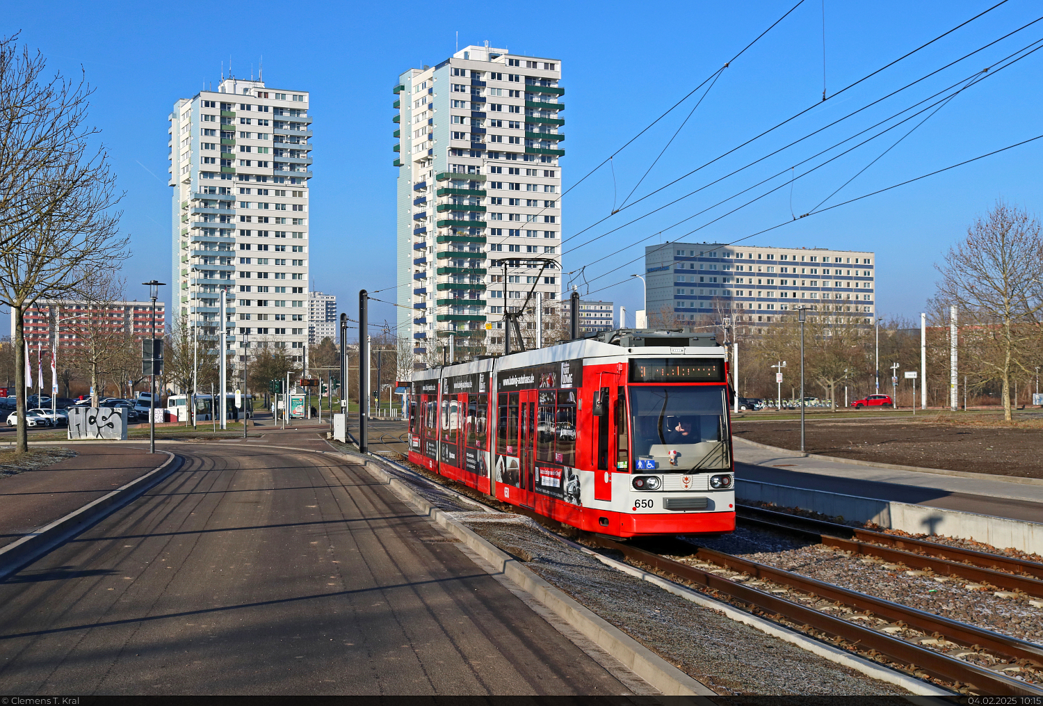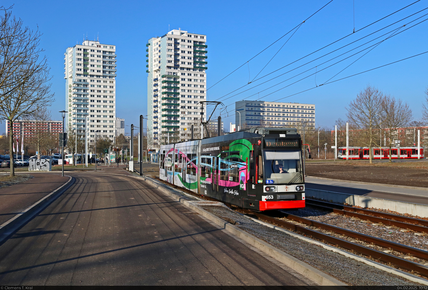 🕓 4.2.2025 | 10:12 Uhr Duewag/Siemens MGT6D, Wagen 653, mit Werbung für die Wohnungsbaugenossenschaft 'Eisenbahn' e.G., unterwegs am Rennbahnkreuz in Halle (Saale).
