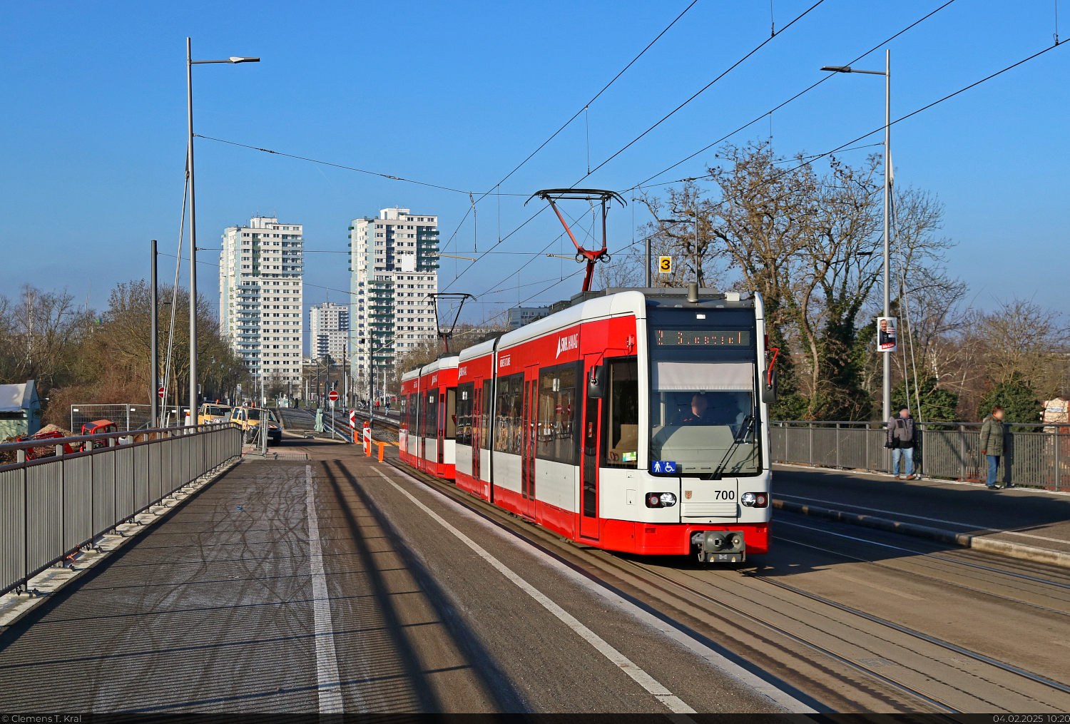 Auf dem im August 2024 eröffneten Ersatzneubau gerieten Wagen 700 und 698 des Typs MGT-K2 (Bombardier Flexity Classic) bei bestem Wetter vor die Linse.