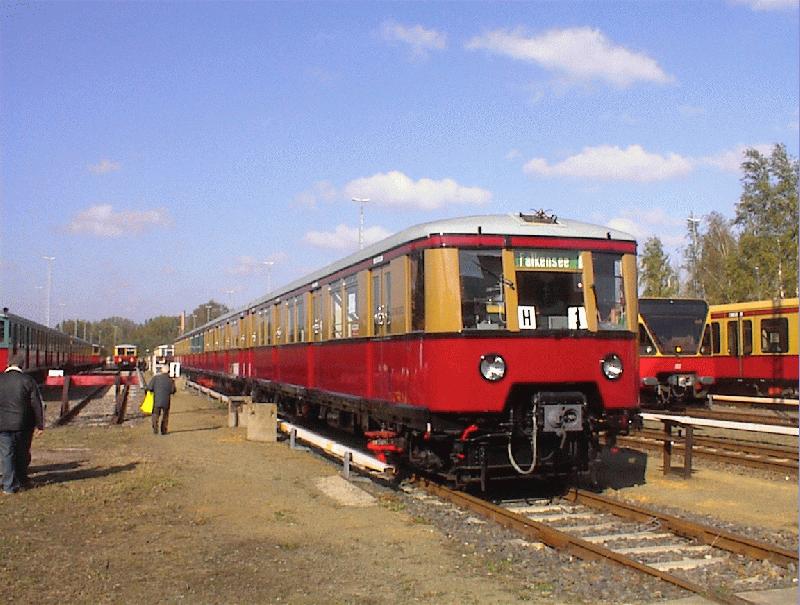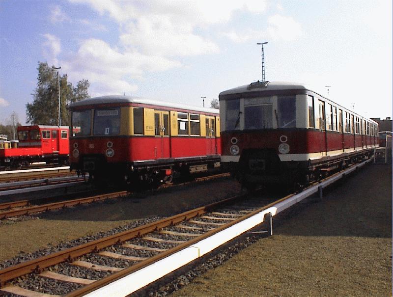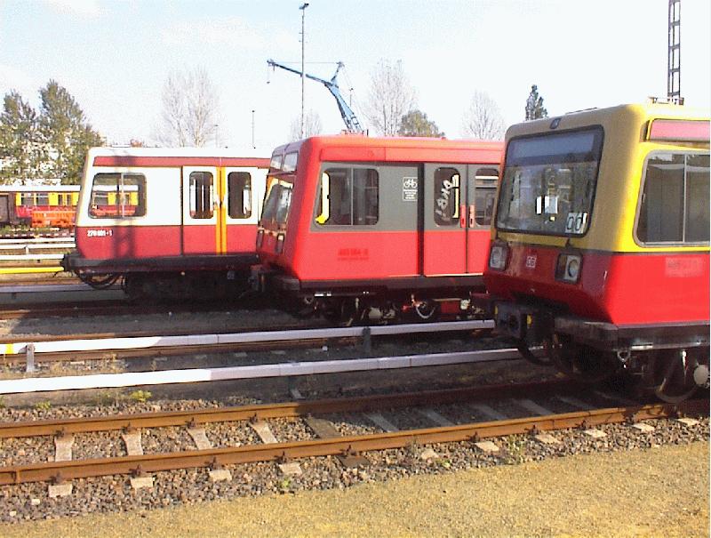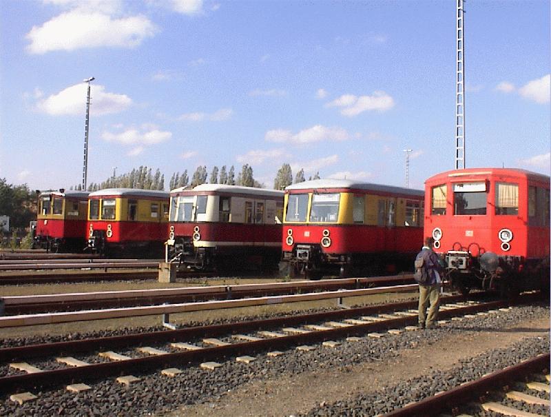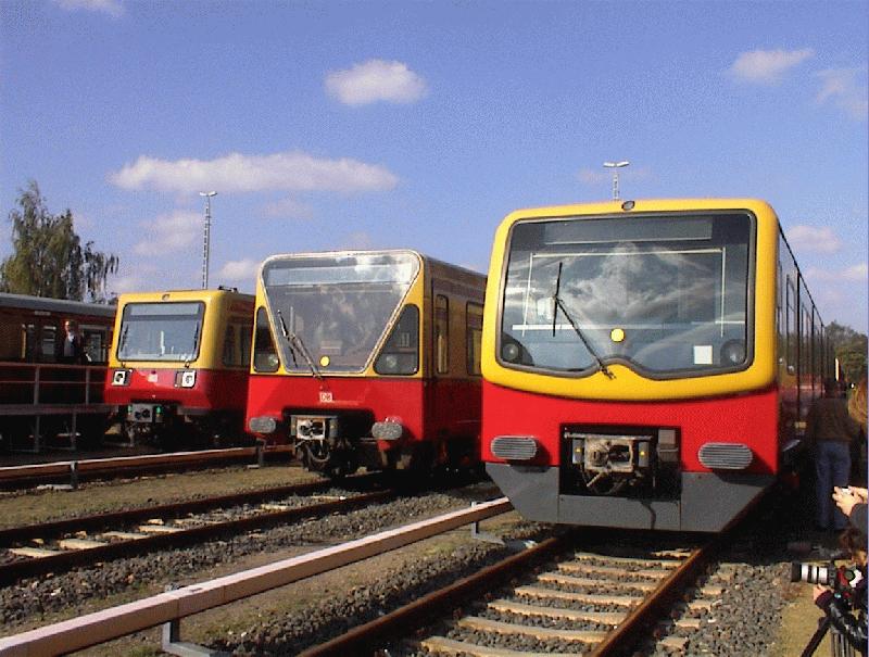 S-Bahnen der BR 485, 480 und 481 beim Tag der Offenen Tür in Schöneweide, 12.10.02. Zu beachten ist die Frontscheibe der 485er S-Bahn, die nach der Rekonstruktion nun keine Unterteilung mehr hat. Bislang ist aber nur der VZ 066 rekonstruiert, weitere 485er wurden lediglich in die rot-gelbe Traditionslackierung umgestrichen.