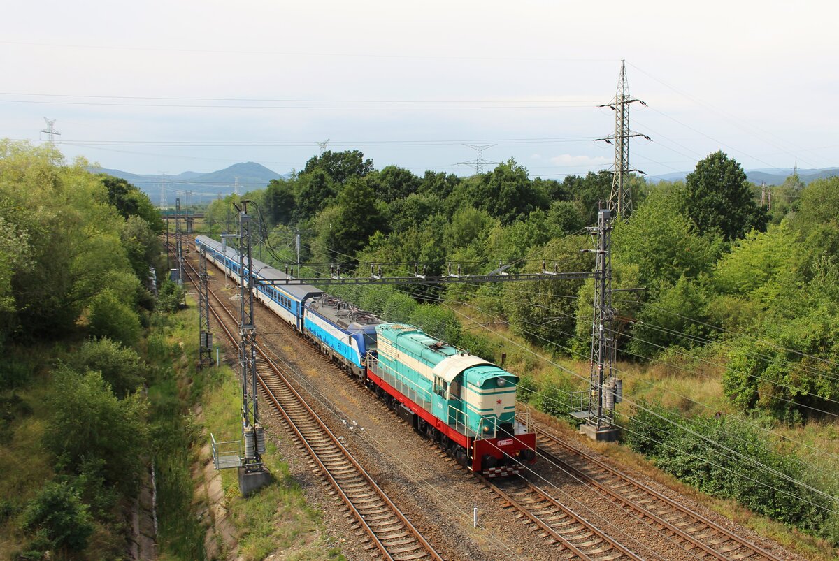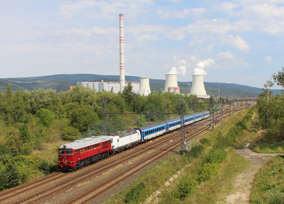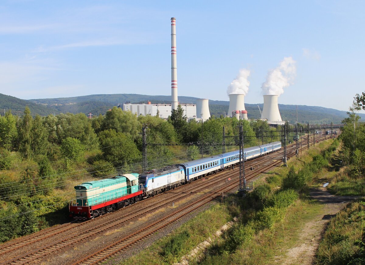 T 679 1600 leistete Vorspann am R 614 mit 193 566, weil am 27.08.23 zwischen Kadan Prunéřov und Klášterec nad Ohří der Strom abgeschaltet war. Hier zu sehen in Kadan Prunéřov. Alexander Hertel