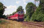 219 161-7 am Wartburgblick bei Eisenach jedoch in der Gegenrichtung. So ein altes U-Boot kann auch mit auf den Film. Es gab Zeiten, da hat fotografieren noch Geld gekostet, da ist manches leider im wahrsten Sinne des Wortes auf der Strecke geblieben, Aug 1999, Negativ Scan (do obrazu)