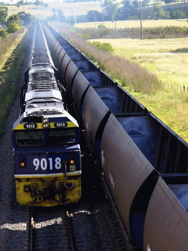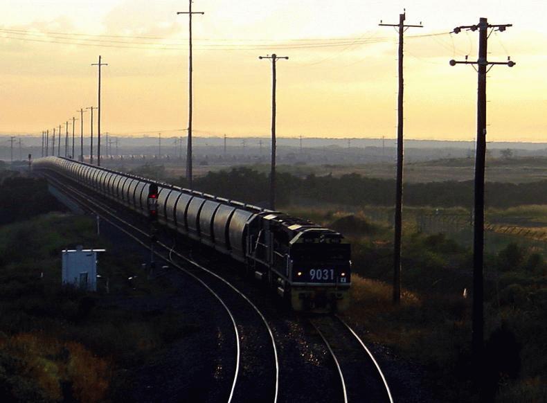 9019 & Co. bei Durchfahrt con High Street Station, Richtung Newcastle, Hunter Valley, Mai 2002
