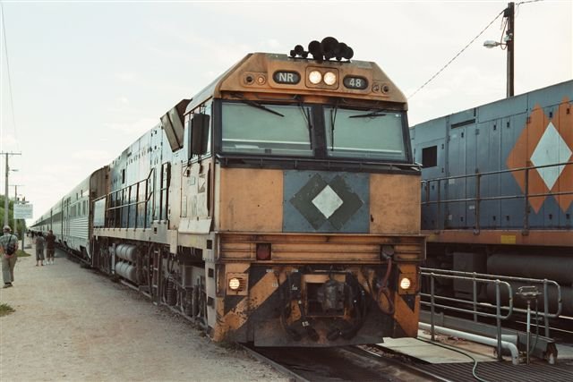 Co-Co-Diesellok NR 48  Northam  (Goninan 1996), eine Normalspurlok der Pacific National in Cook, 30. Oktober 2006. Die Loks der NR-Class sind heute die Standardloks auf dem australischen Normalspurnetz. Mit modernen General-Electric (GE)  Dash 9  Traktionskomponenten versehen sind die Maschinen sehr leistungsfähig (4020 PS), die Besonderheit ist aber, dass sich die Maximalleistung je nach Einsatzzweck in drei Stufen reduzieren lässt. Die Vmax beträgt 115 km/h.