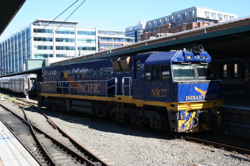 Containerzug mit drei Lokomotiven kurz vor North Adelaide (SA) am 3. Oktober 2006. Die zugführende Maschine NR 26 ist eine der drei Maschinen mit dem vornehmen Anstrich des  Indian Pacific  während die rote Zuglok NR 75 im Farbkleid des  The Ghan  prangt. Im  Sandwich  zwischen den beiden NR-Class läuft eine AN-Class im Anstrich von National Rail. Die legendären Fernzüge  Indian Pacific  Sydney-Perth sowie  The Ghan  Adelaide-Darwin werden von der Great Southern Railway betrieben und mit Loks aus der 120 Stück umfassenden NR-Class von National Rail bespannt. Da jedoch für diese Reisezüge keine speziellen Umläufe bestehen, trifft man die farblich entsprechenden Loks vielfach an Güterzügen, während die Expresszüge auch mit  normalen  NR gefahren werden.