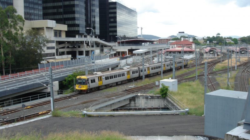 Ein Vertreter der neueren Generation der Electric Multiple Units (EMU) fährt am 24.03.08 aus Roma Street Station in Richtung Central Station aus.