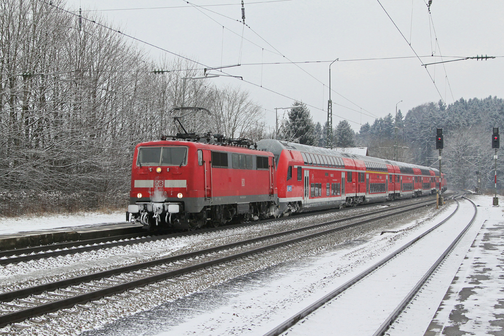 101 067-7 schiebt einem EC in Richtung München, aufgenommen am 12. Januar in Aßling.