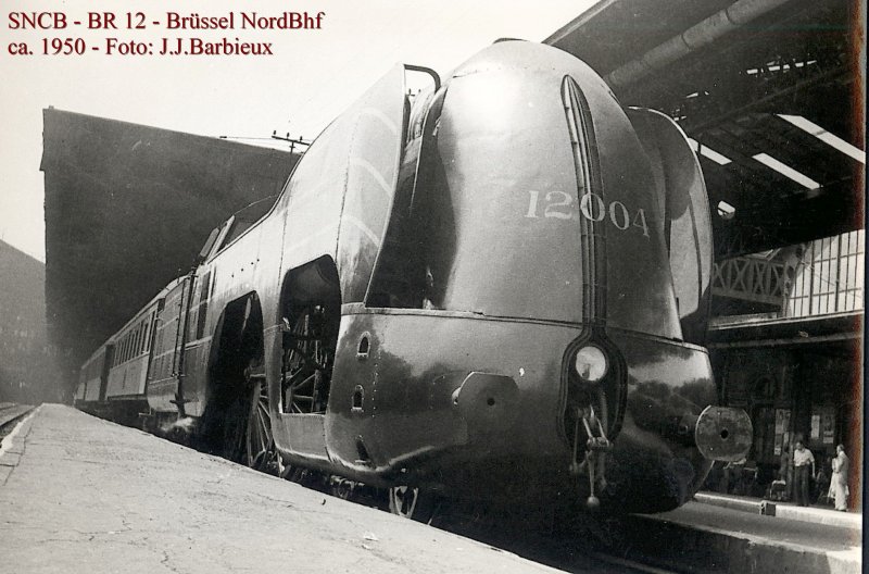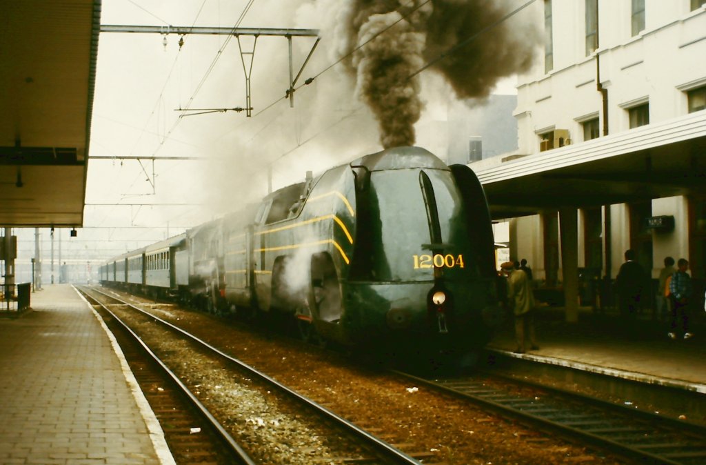 Die rollfähige Museumslok 12004 der SNCB wartet auf Hochglanz poliert im Bahnhof Liège Palais auf ihre Fans. 2001