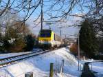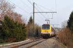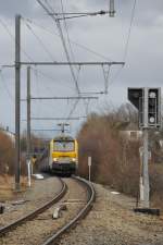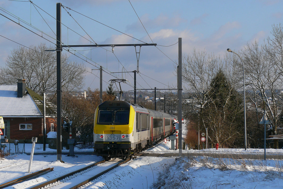 Am 06/03/2010 war Eupen noch von einer geschlossenen Schneedecke überzogen. Die SNCB-Lok 1357 schiebt den ICa Oostende - Eupen auf dem letzten abschüssigen Stück dem Bahnhof Eupen entgegen hier, aufgenommen am BÜ Buschbergerweg.
