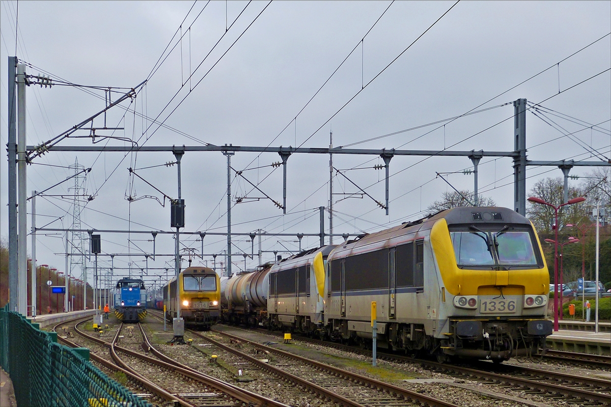 . Echt viel los in Rodange. SNCB HLE 1336 steht mit einer Schwesterlok abgebügelt mit einem Zisternenwagenzug in Rodange abgestellt, in der Mitte steht SNCB HLE 1314 mit einer Schwesterlok die als Lokzug den Bahnhof in kürze in Richtung Athus verlassen wird, daneben steht CFL Cargo 1502 mit einem Güterzug. 08.01.2018 Hans