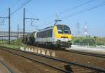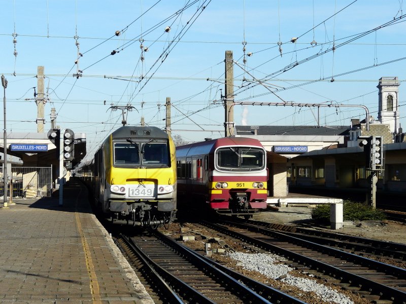 E-Lok 1349 mit 12 Personenwagen im Schlepp und Triebzug 951 verlassen zusammen den Bahnhof Brüssel Nord in Richtung Brüssel Midi. Triebzug 951 hat dort Endstation, während die E-Lok mit Zug weiter nach Oostende fährt. 17.02.08