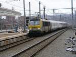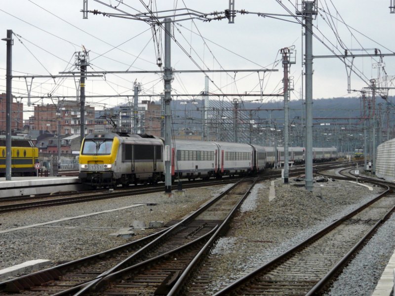 E-Lok 1351 mit ihrem langen IC aus Welkenraedt schlängelt sich über die vielen Weichen in den Bahnhof von Liège Guillemins am 09.03.08.