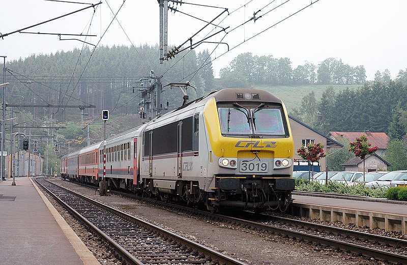 3019 erreicht mit einem Zug aus Belgien den Bhf von Troisvierges.