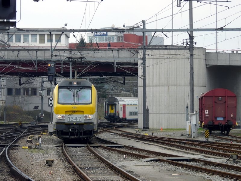 Danach konnte Lok 1347 auch das Kopfgleis verlassen, um später wieder am die Spitze des Zuges zu gelangen. Hinten warten die Dostos, um von der MAK zurückgedrückt zu werden. Bild aufgenommen im Bahnhof von Luxemburg am 05.04.08.