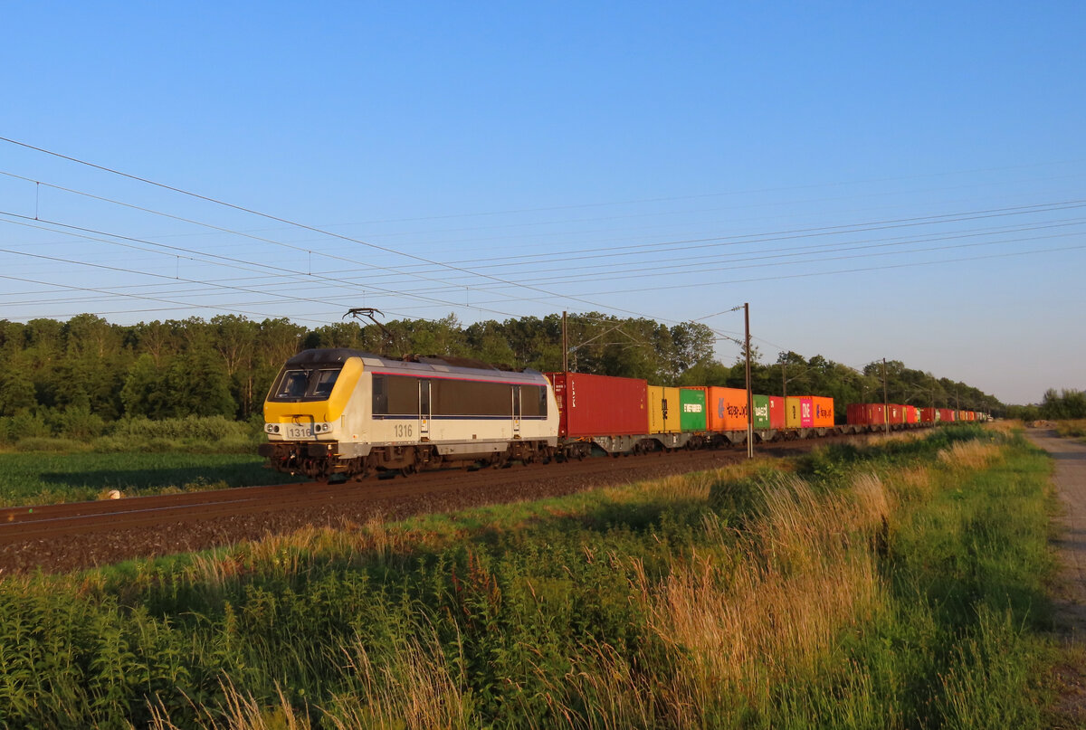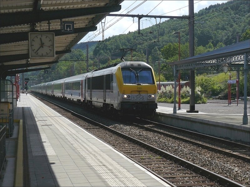 Der IC Eupen-Ostende wird von E-Lok 1356 am 12.07.08 durch den Bahnhof von Pepinster in Richtung Lüttich gezogen. Rechts im Bild sieht man den gepflegten Blumenschmuck, sowie das renovierte Glasdach. (Hans)